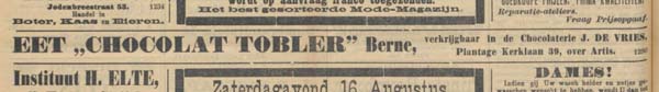 Ook is De Vries depothouder voor Amsterdam van de American Vruchtenpudding ('te koop in elf smaken') van A.J. Polak uit Wildervank. En wat chocolade betreft houdt hij het niet alleen bij die van Bensdorp, hij verkoopt ook ‘chocolat Tobler’ van Berne en ‘Vegetariërs - Chocolade’ van het Nederlandse Vegetariërs Verbond
